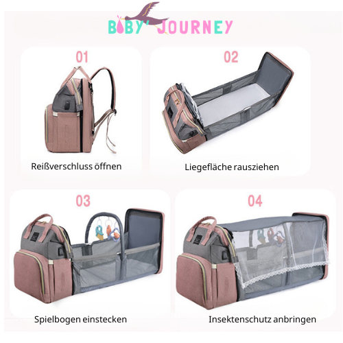 Mit unserer Wickeltasche, die nicht nur als stylischer Rucksack fungiert, sondern sich auch in ein bequemes Bettchen verwandeln lässt, damit dein Baby überall entspannt schlafen kann. Diese Tasche bietet eine durchdachte Kombination aus Funktionalität und Design, die das Reisen mit deinem Kind einfach und stressfrei macht.