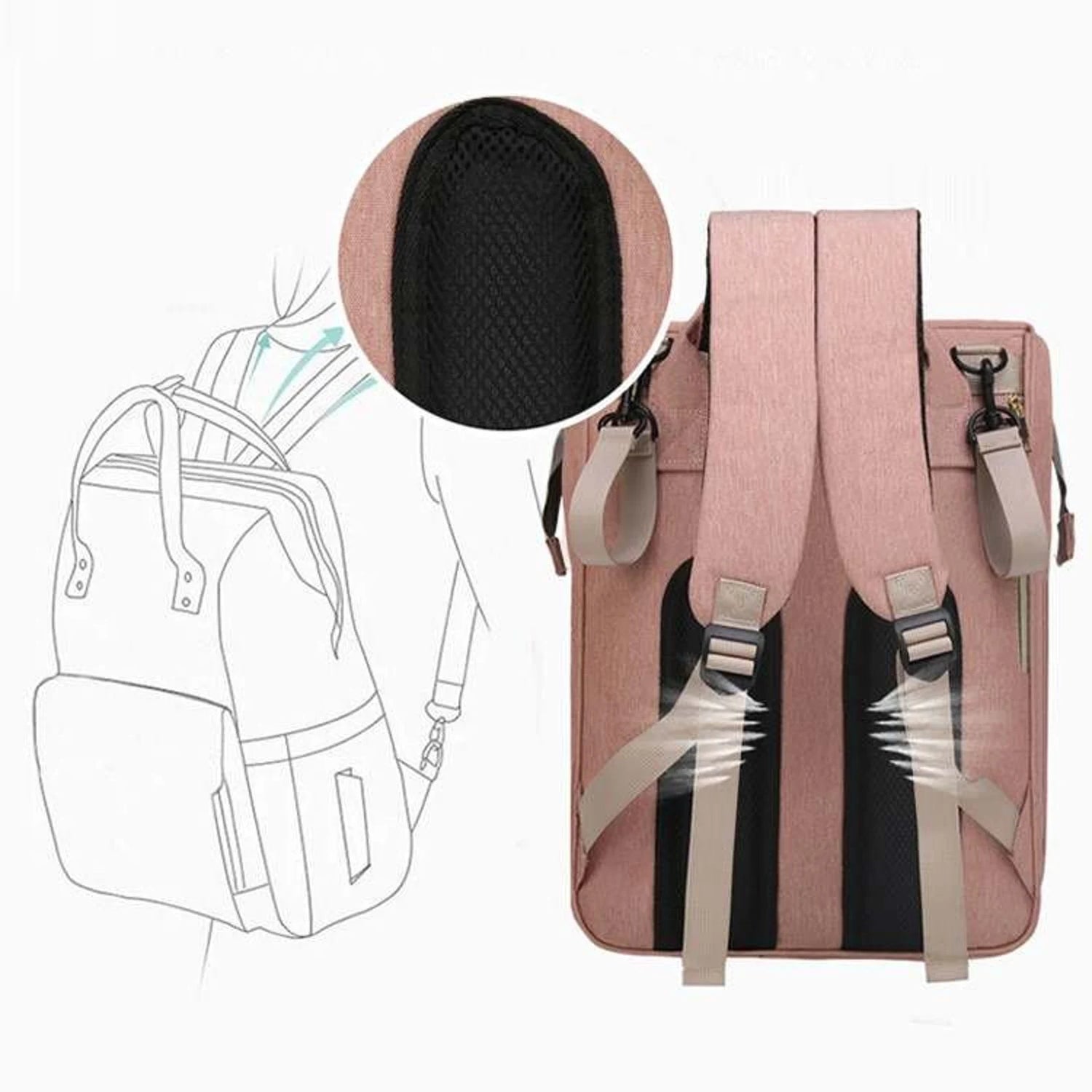 Mit unserer Wickeltasche, die nicht nur als stylischer Rucksack fungiert, sondern sich auch in ein bequemes Bettchen verwandeln lässt, damit dein Baby überall entspannt schlafen kann. Diese Tasche bietet eine durchdachte Kombination aus Funktionalität und Design, die das Reisen mit deinem Kind einfach und stressfrei macht.